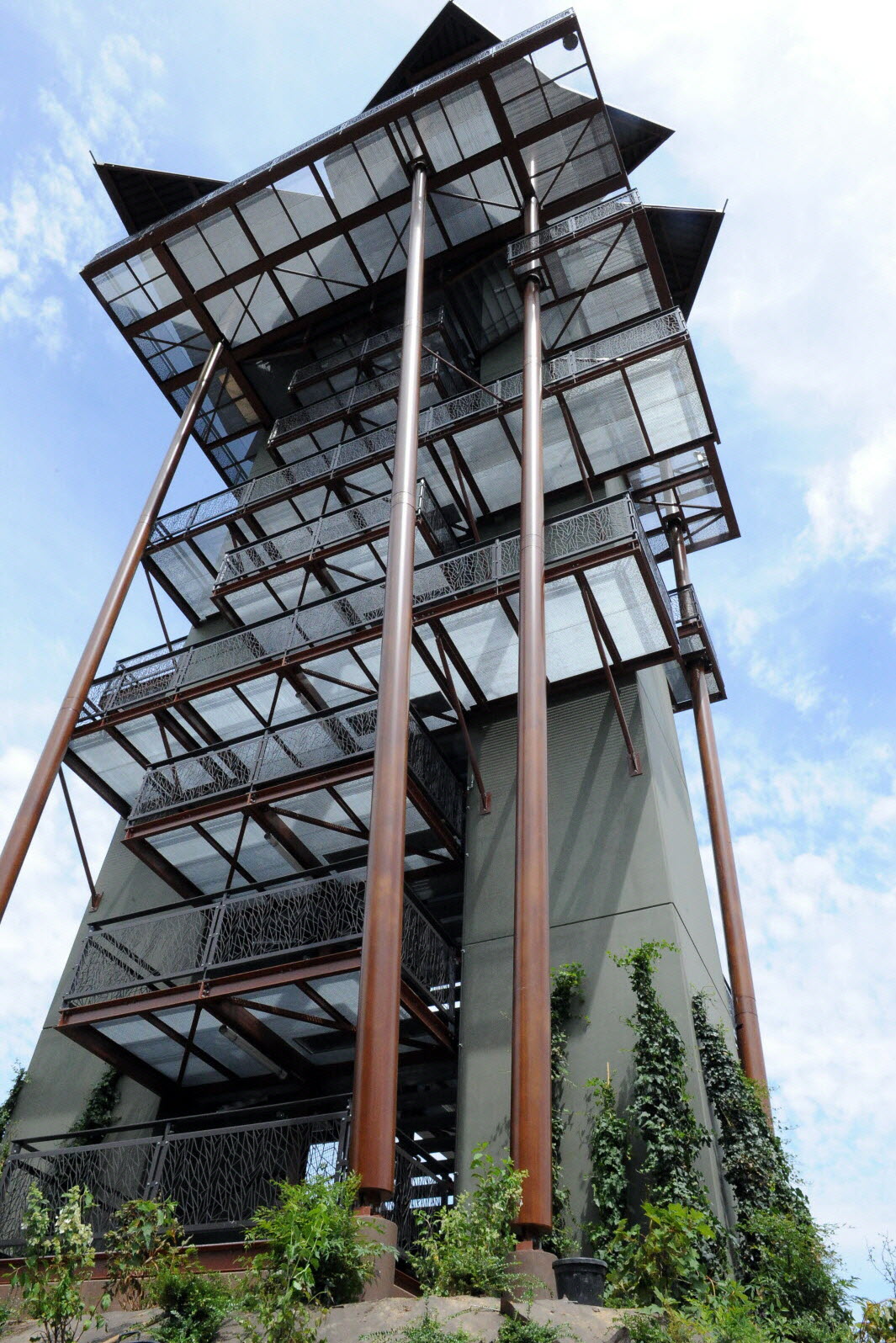 Conçue « Comme une cabane dans les arbres » la tour en reprend les principales caractéristiques : structures inclinées, passerelles dissymétriques, toitures aux formes aléatoires dont l’ensemble donne l’impression d’une construction greffée aux arbres du parc, se mélangeant parfaitement dans la canopée.